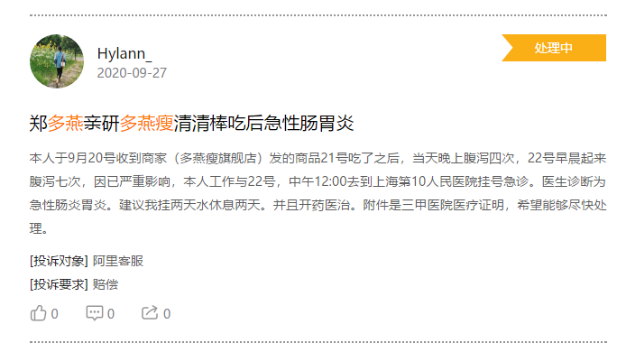 中国网财经记者发现,除上述通报中提及的“多燕瘦酵素吸吸冻(番石榴味)”产品,还有消费的人在第三方投诉反馈平台上反映称,销售代理号称“郑多燕亲研的‘多燕瘦清清棒’”,在食用后也出现急性肠胃炎症状。