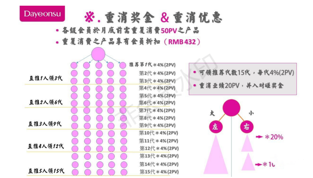 据报道,成为多燕瘦代理后,推荐新代理加入,可获得40%的推荐奖金及层碰奖金,层碰奖金分为左右大小两个区,可获得40%~25%的奖励。另有对碰奖金10~20%,可拿无限代。还有重销奖金和重销优惠:直推1人领3代、直推2人领6代、直推3人领9代、直推4人领12代、直推5人领15代,呈金字塔结构可以进行发展。每笔奖金拨放80%为现金点、20%为活动点数。